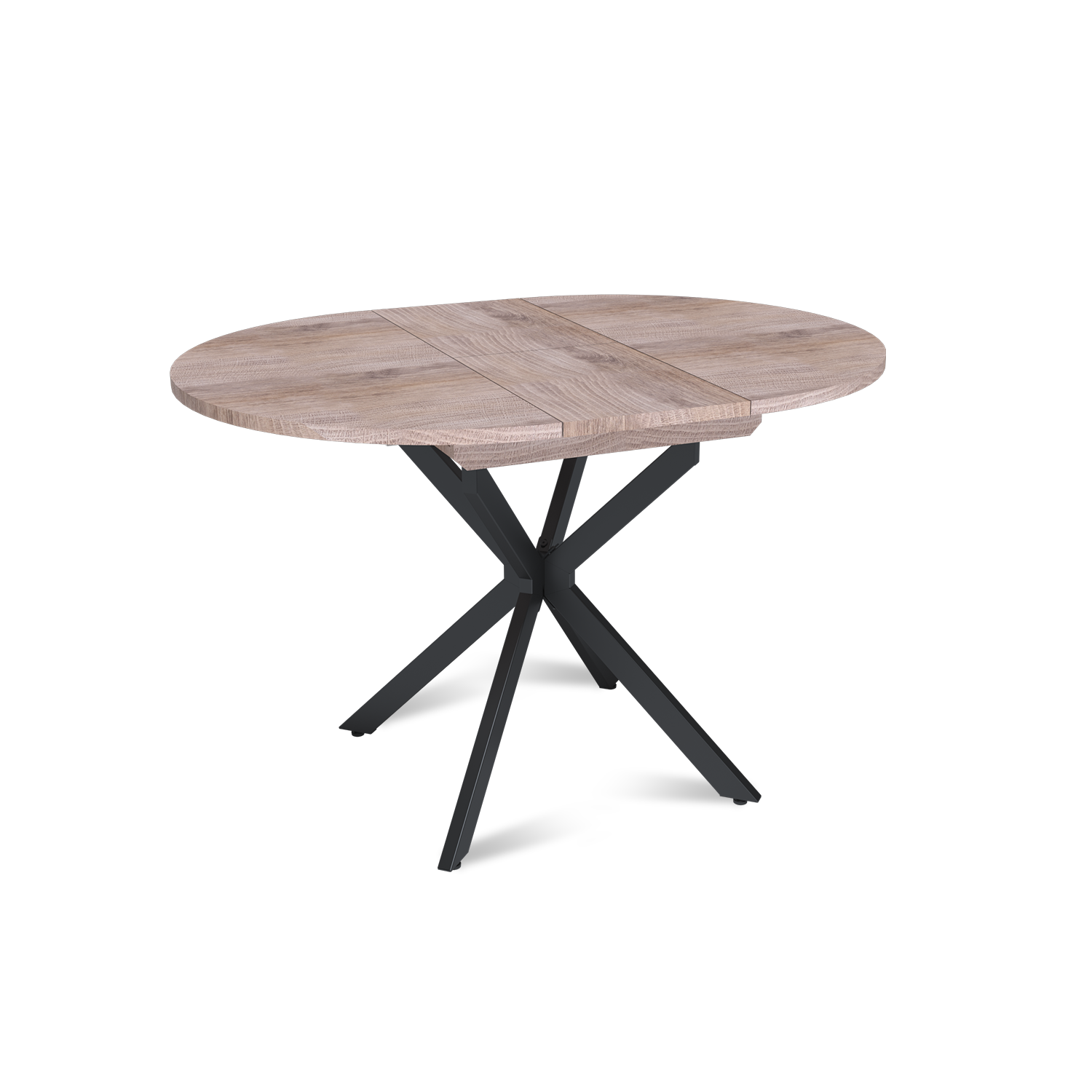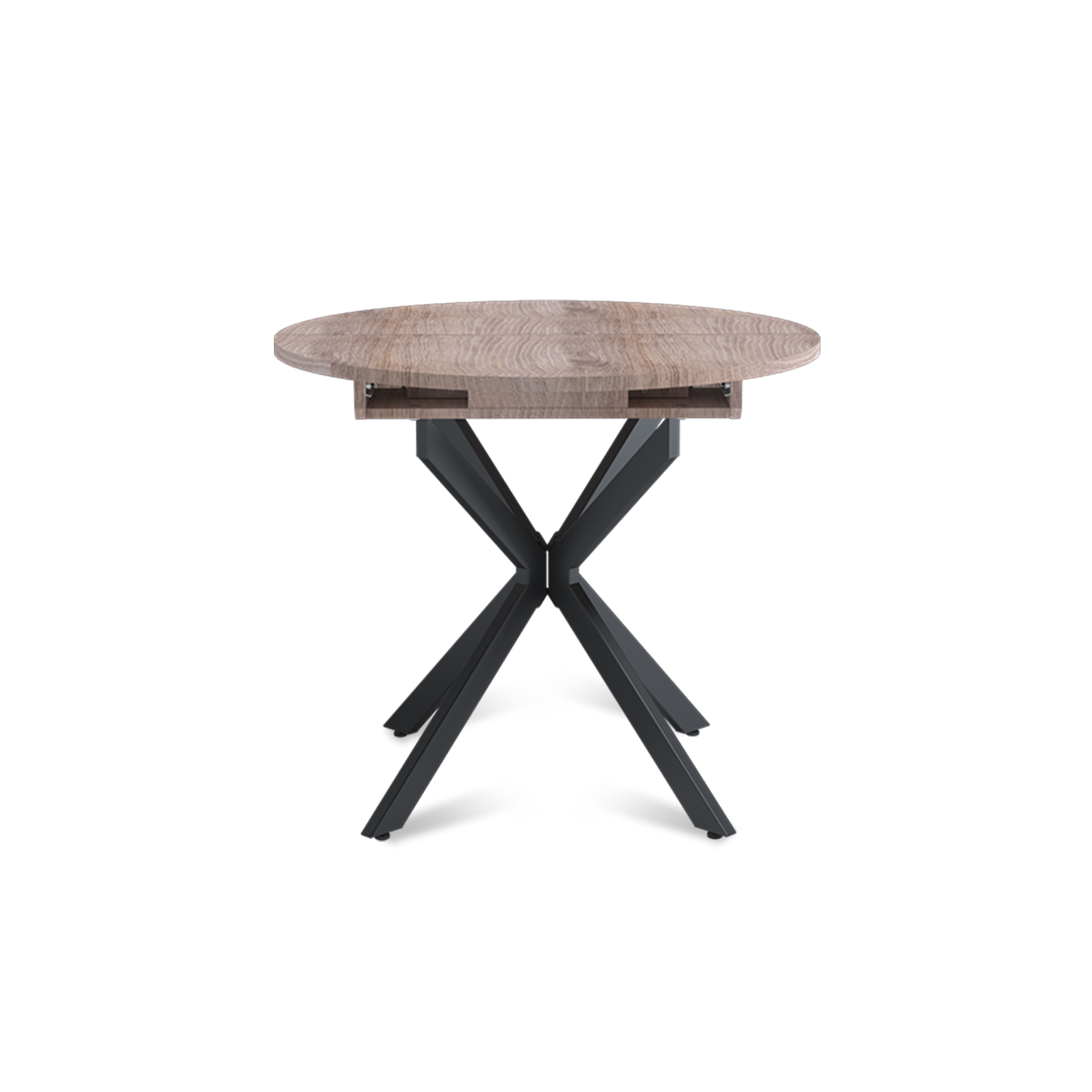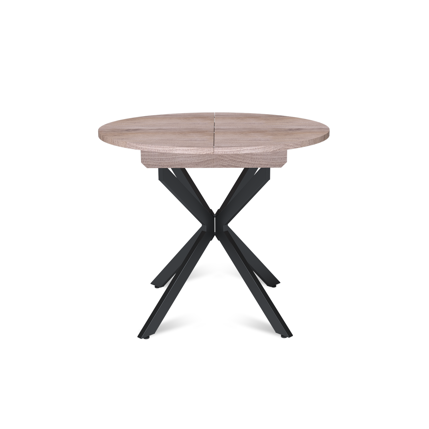 Трансформация стола построена на синхронном принципе: обе половины столешницы расходятся одновременно, сохраняя идеальную геометрию. Центральная вставка-«бабочка» шириной 30 см плотно фиксируется между ними, исключая люфт и перепады высоты. В разложенном виде стол выглядит монолитно, а механизм не доставляет хлопот при каждой сборке. Вставка повторяет цвет и фактуру столешницы, благодаря этому конструкция выглядит монолитно: переход от столешницы к опорам визуально сглажен, а общий вид остается максимально аккуратным и продуманным.