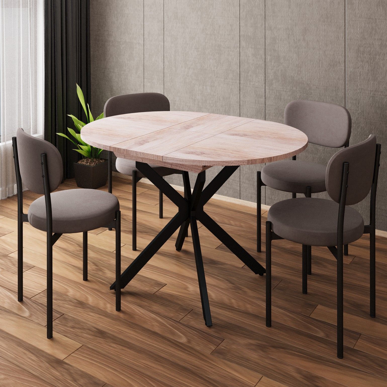 Раздвижной обеденный стол Твист разработан для малогабаритных кухонь и квартир-студий: в сложенном виде компактный и не занимает пространство, при необходимости легко раскладывается для гостей. Особая форма опоры позволяет беспрепятственно задвигать стулья под стол, делая посадку удобной. Модель выглядит актуально благодаря чистым линиям, спокойной текстуре столешницы «под дерево» и выразительной Х-образной опоре, которая и дала название линейке.